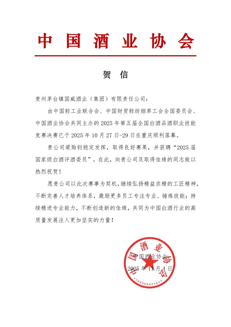 中国酒业协会相关负责人表示,国家级白酒评酒委员的评选是对行业人才真功夫、硬实力的检阅。梁贻钧的脱颖而出,既展现了新生代酒企人的专业风采,也为中国白酒行业的高质量发展注入了新鲜血液。更令人瞩目的是,国威酒业此次并非“单兵突围”:企业选派的除梁贻钧外的5名技术人员全部荣获“贵州省白酒评委”称号,这份成绩单充分展现了国威酒业雄厚的技术人才储备。未来,这些技术骨干们将以国家级评委的专业视角,为酒厂的品质把控、产品创新提供核心技术支撑,助力品牌在传承与创新中持续前行,为中国白酒的永续发展注入了澎湃的青春活力。