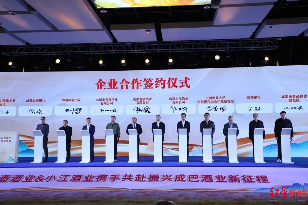 签约环节上,蓉酒酒业公司、小江酒业公司联合合作伙伴四川小角楼酒业公司,共同与中国农业大学四川现代农业产业研究院、四川旅游学院、成都银行、成都农商行、成都市食品检验研究院、中粮(成都)粮油工业有限公司、成都友一包装材料有限公司、成都市川泰玻璃有限责任公司等签订合作协议,覆盖科研技术、金融服务、检验检测、供应链等多个领域